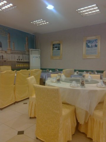 这是少数民族一条街,基本不用担心会受骗上当。坐下点了10个烤羊肉,一个馕包肉,一个新疆拌面,一个新疆炒面,都是大盘的,虽然等菜的时间长了点,好在味道没有让我失望,这面和平时吃的面有所不同,估计是用的面粉不同。吃好饭,还能通过四周墙上的伊斯兰寺庙的介绍,对中外的伊斯兰寺庙有所了解。