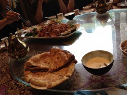 西域盛宴老实说是我吃过的西部餐厅里比较一般的店,菜一般不说,服务也蛮一般的,点餐的时候老是推荐客人点贵的,太急吼吼的样子。他家的羊肉串相对来说还算性价比高的,3元一串,我点了好几串,烤的味道也还不错,吃得出是羊肉。大盘鸡里都没啥鸡肉的,配菜比主菜多。酸奶都是自制的,虽然有点酸,不过好在新鲜,上面会撒几颗葡萄干,有点儿新意。…查看更多