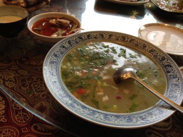 感觉比较一般,虽然还蛮有新疆特色的,但是东西做的有点不太地道,杂七杂八的感觉。馕超级干巴,比以前吃的都要干,而且不香,没味道,蘸料也很奇怪,不知道是炼乳还是什么。羊杂汤也是料很少的感觉,羊杂切得很碎,都看不出是什么,羊膻味不是很重,但是超级咸。…查看更多