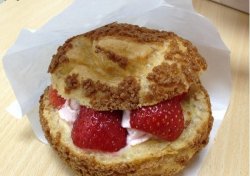 他家的泡芙,价格贵是贵,但是造型和味道都不错。路过的时候,看见店面的料理台上,店员正在制作草莓泡芙,看到一块块的颜色新鲜的草莓被放在奶油上,于是就被吸引了,于是买了15元一个的草莓泡芙。泡芙的外皮,很酥很脆,亲亲一咬就碎在口中了。因为酥脆的外皮,综合了里面奶油小小的油腻;草莓虽然不是很甜,但是清爽的口感,同样让厚实的泡芙变得爽口了。查看更多