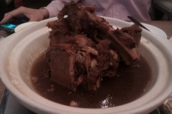 很考究的一道菜,下面还有个像电磁炉一样的炉子,用来保温.砂锅不大,但是里面的牛骨非常的大块,很有西北的风情.有三大块.其实上面得肉没有多少,重要是吃的骨头,还附有吸管,可以吸里面的骨髓.肉虽然不错,但是烧得很酥,很入味.查看更多