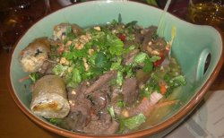 这家餐馆还是挺有特色的,一直听说过名字前几天终于去了。这里的春卷超赞,太好吃了!蔬菜春卷和鸡肉春卷都很好吃。我点了个生菜春卷的粉,结果服务员告诉我说中国人吃不惯这个,建议让我点猪肉鲜虾薄饼。结果朋友告诉我这个薄饼不太好吃。于是我坚持要了生菜春卷的粉。因为里面放了薄荷叶,喜欢薄荷清凉的口感。里面有春卷还有肉丝,另外蔬菜是生菜豆芽,洋葱腌制的胡萝卜和萝卜。粉很细,个人觉得挺好吃的,因为我比较喜欢细的粉,大概粉丝的粗细吧。饭后的椰子布丁觉得有点儿怪怪的,味道还好啦。…查看更多