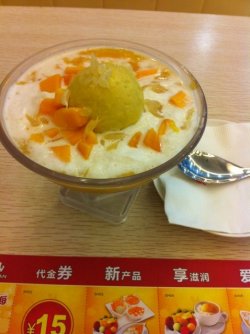 好朋友推荐的。说这家的芒果味道不错的。蛮新鲜的~~然后那天刚好看到有团购。所以试着尝试了看看。这份自己出米买的话。38米。团购19米。还有很多优惠券~~芒果颗粒蛮新鲜的。整体奶味足足!就是里面的文丹颗粒有点苦味道。毕竟是甜品。还是喜欢全部甜的好~~最上面的是冰淇淋球。味道还是可以的~~原味~~~蛮喜欢的~~夏天嘛。哈哈~~