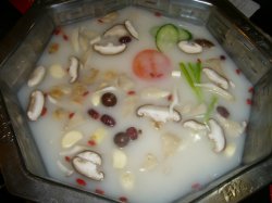 大热天吃火锅!哈哈!这家火锅店在虹口足球场,所以交通还是蛮方便的。他们家的特色锅底有骨头锅,酸菜鱼,老鸭锅,都是58块一个小锅,个人比较喜欢骨头锅,一个小锅,有4跟骨头。从图片可以看到,锅底的料还是很多的,豆腐皮,玉米,笋尖什么的,两个人,一个骨头锅绝对要饱的!这家店生意很好,所以服务人虽然态度很好,但也有时会无暇顾及你。所以,耐心点吧。另外,他们家的包厢特色是:每个包厢口都有一个电风扇对着吹!哈哈,可能是当时设计不好吧,包厢里的空调不是很足,所以不推荐坐包厢!查看更多