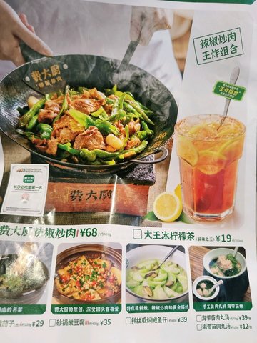 費大廚辣椒炒肉 / 皮蛋青椒擂茄子 / 東北鮮米飯 / 大王冰檸檬茶 / 香酥大鲫魚 / 砂鍋嫩豆腐