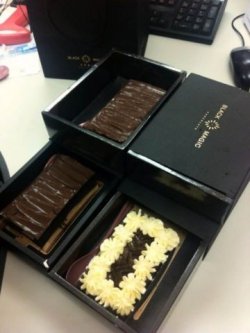 嗯。小亚也是因为小婉MM细心,有了好东西都想着跟我们分享。她朋友从上海带回来一盒这家的巧克力,虽说小亚还不了解这个牌子,但是光是看外包装就觉得很不错了。好东西如果有好的包装那就更完美了。这家店的巧克力包装就很上档次,统一的黑色袋子盒子,简单的logo,看着就觉得高大上。先不品尝就已经觉得很有feel了。打开盒子一看。 哇哦~~~~~ 金闪闪呢。。。 不就是现在时下最热门的土豪金吗?真的闪花眼啊,闪花眼。。。。盒子里配的小叉子也很别致,跟小恶魔的小叉一样的乖巧。嗯。小亚对巧克力没什么研究,所以也说不上具体的感觉。好吃是肯定的,口感也多好的。因为吃巧克力对于小亚来说是辅助性的爱好。所以吃糕点之类的才是正道。看介绍说,这家的蛋糕什么的都很赞很赞。因为成都还没有所以小亚也吃不到了。毕竟上海还是有点远,所以小亚超级想这家店赶紧开来成都。小亚一定第一时间去捧场,吃巧克力蛋糕,酒酿樱桃巧克力蛋糕,芝士巧克力蛋糕。。。。要吃遍这家所以的品种。。。。。 哈哈~~~~赶紧来成都吧。成都的吃货们等着的呢。哈哈。。查看更多