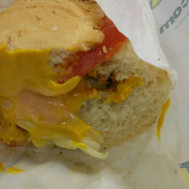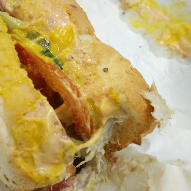 赛百味家的三明治很不一样,感觉有点像热狗啊,很多东西,料多实惠。买的是金枪鱼的,鱼肉量好多,而且很鲜,鱼肉很细嫩,特别鲜,加了好多蔬菜,喜欢酸黄瓜,酸酸的,脆脆的,然后加了蛋黄酱和番茄酱,吃起来酸酸甜甜的,加上外面全麦面包的那种口感,嚼劲很足,嗲