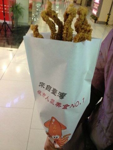 在底楼美食街里,找起来有点困难,门面不大,不过鱿鱼很大哦,比脸蛋还要大的整只鱿鱼,20元一份,外皮炸的好酥脆,鱿鱼实在是太大,吃起来就不顾形象啦哈,鱿鱼很有嚼劲,有几种调味粉可以选择,两个人吃一份差不多