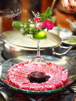 环境很不错的一家店,当然价格也偏高。餐具很精致~这边菜式很多都是创新菜,很吸引人!锅底这次选了清汤锅,口味淡一点~为了能更好的尝到食物本身的口味开胃菜是话梅花雕虾,摆盘很不错,两只虾子在一个小杯子里游泳~哈哈。虾肉很鲜美,有酒香。红酒顶级雪花肥牛,真心贵啊!好像要400+了,盘中央有个倒扣着的杯子,里面满是红酒。牛肉看起来很新鲜,条纹清晰,吃起来有浓浓的酒味,味道非常不错!芝心酿虾丸,芝心真的是很浓郁啊。虾丸肉质很结实,而且吃起来QQ的~山水豆腐,豆腐嫩嫩的,很新鲜,吸收了火锅的汤,尝起来鲜味无比~油炸豆腐皮,很爽脆,入口即化。而且不油腻~娃娃菜,最后来点清单口味的。菜很新鲜哦~结帐时,发觉这边是要收10%服务费的。。。不过这顿饭吃了很开心,服务质量很不错。以后还会来~查看更多