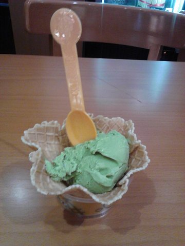 天冷也要吃冰淇淋哦,在暖气环境里吃最幸福了。 这家酷圣石的店面算是不小了,在龙之梦里面,但是一点也不嘈杂,坐坐蛮好的。买了个单球,是店员推荐的燕麦味的,冰淇淋球里吃得到燕麦颗粒,有点小嚼头,冰淇淋的口味偏甜了些,他们家的东东貌似都挺甜的。吃完要喝点水,清清口。 服务生的态度很不错哦。