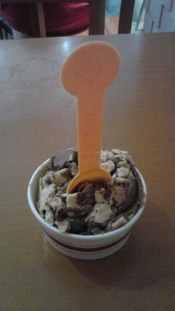 酷圣石的冰淇淋我一直觉得偏甜了,所以这次去吃的时候,口味选了黑巧克力,想着可能味道醇厚些,少点甜。 店员挖了个大大的球,问我华夫是要碗呢,还是打碎混在冰淇淋里头,我选了华夫碎。黑巧克力的味道很浓郁,不过还是有点小甜的说,华夫碎也是甜甜的,吃起来有点小腻。 这家分店环境不错,店员的态度也挺好的!