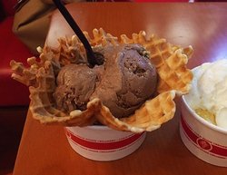 冰淇淋店,就在燕莎奥特莱斯购物中心C座1楼,逛街顺便吃的,主要是这里很大,就光C座,就逛了快一天了。买了一份巧克力冰淇淋配华夫,华夫很好吃,脆脆的,就跟奶油曲奇似的,巧克力冰淇淋入口很爽滑,奶油成分很高,可可味也挺浓的。人均50元。查看更多
