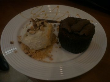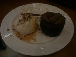 他家新推出的新品,巧克力熔岩和冰激凌。冰激凌是普通的香草冰激凌,冰冰的口感,碰上刚刚加热出来的熔岩巧克力,撬开巧克力蛋糕的上层,用勺子勺一勺流动着的巧克力,嘴里冰凉的冰激凌感觉还没完全退却,马上就被另一种热情的甜美覆盖了,于是在一冷一热的两种极致境地里,体味不同的美味口感。…查看更多