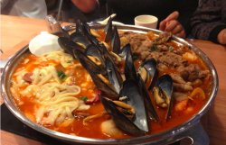 很正宗的韩国年糕火锅~由于店家的炉子不够,将四种锅底合成一锅辛拉面分量很足,芝心年糕很好吃,还有紫薯的芝心年糕海鲜是虾,鱿鱼和青口部队火锅是各种丸子烤肉火锅是肥牛,娘亲说最喜欢肥牛,口感肥硕,很实在芝士年糕中的芝士和辛拉面混合后口感超级满足的~さらに見る