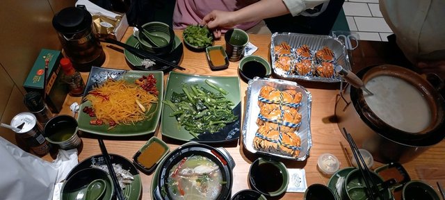海鮮粥,普寧豆醬炒麻葉,香煎野生雜魚仔,豆醬煮剝皮魚,酸辣土豆絲,薑汁炒芥蘭
