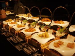 金钱豹最大的好处就是非常全,想吃啥都有,于是俺就绕着餐台转了一圈一顿拍啊离我们包房最近的是鸡尾酒区韩国料理区,多是泡菜,拌饭啥的都没有见到。。。铁板区,要拿小夹子取的,试了羊排和腰子,包间空调太凉,吃的时候都冷了,比较一般了。。。关东煮也有一个专门的区域我最爱的一个区域,各种广式点心和卤水烧腊区虾饺一般,凤爪不错,叉烧酥我比较喜欢~~热菜区,都比较普通热菜区,都比较普通另一个我爱的区域又来了甜品区冰激凌区巧克力区~~巧克力球和布朗尼都很有爱,而且很好吃,搅拌在冰激凌里非常美味冰激凌两种,哈根达斯和一个美国什么的,美国那个没记住,都不错,哈根达斯没有抹茶的正好在另一个柜台里找齐了各种芝士蛋糕,还有巧克力喷泉。不过芝士蛋糕的水准比较几年前退步好多。。。披萨区,各种披萨,没吃,太占地方日料区松茸汤和茶碗蒸都不错,生鱼片类俺不吃。。。当天俺们着实没少拿,看看战果~酥皮奶油汤,金钱豹的出品一直不错,并且保持了一贯水准广点们和腊味们各种烤肉奶茶和西瓜汁装奶茶的瓶子非常有爱啊!而且奶茶味道也很好冰激凌甜品蛋糕以上是一部分我们吃的,还有其他的就没怎么拍了查看更多