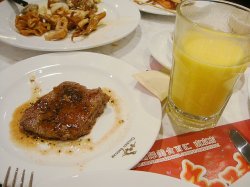 奶油蘑菇汤。自己加奶粉和瓜子,很好吃,很香。小笼包,挺一般的.南瓜奶油浓汤,南瓜味道已经荡然无存了·····烤肠,鸭肉什么的,味道都还不错,可是都是露天敞开放着的,一开始就是冷的·····哈根达斯,巧克力酱可以自己加。我后来不加了,实在太甜腻。提拉 米苏,唯一我觉得不错的甜点。烤乳猪,跟朋友迫不及待的连着饼子放进嘴里,哎呀妈呀,这个乳猪味道就像炸的酥酥的油渣子,酱又特别厚特别甜,跟朋友都吐掉了·····贝赛斯的冰淇淋,我同样不喜欢,非常甜腻。果汁。西瓜汁,芒果优格,菠萝汁,苹果汁都不错。这个是木瓜牛奶非常难喝。 铁板椒盐鲳鱼 上面竟然撒香橙酱,难吃的一踏·····单点的石斑鱼,有点腥木瓜牛奶么有牛奶味,就是木瓜原浆,苦咋咋的。看杯子壁就知道,非常稠厚。某种鸡尾酒,奶味比较重,味道挺特别单点的羊排,居然也咬不动·····粤菜区的排骨,一般。单点的什么鱼,比较简单,纯粹。还不错。凤爪,很咸。不喜欢。随便吃了点水果。西瓜不怎么甜,火龙果味道也一般。鸡尾酒难喝的一米····熟食区的羊排。做好了可以直接夹走的。非常老,塞牙缝的厉害·····而且一开始就是温的。熟食区的牛排,要多少切多少给你。切的时候血淋淋的。其实味道很好也很嫩。铁板牛舌,需要单点的。吃了2份,很好吃,就是少,一份就2片。没有吃鲍鱼,燕窝,不能免俗的吃了一碗鱼翅,加了些什么红醋,味道不错。朋友说勾的芡太多了。铁板鱿鱼,很硬不好吃查看更多