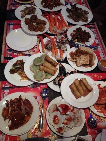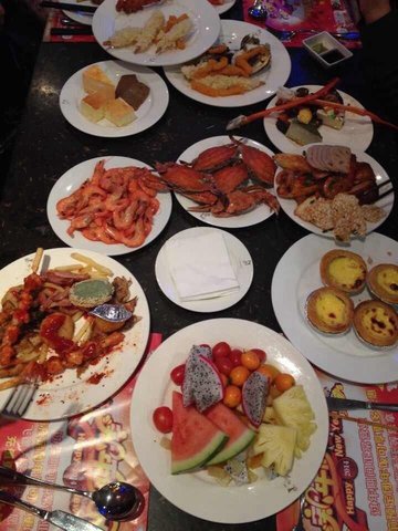 感觉这家的自助是蛮上档次的哦,每次去的时候都感觉人蛮多的,估计是因为味道蛮好比较喜欢吃他现烤的牛排啊,感觉蛮新鲜的,可以自己选,挑中哪块算哪块还有就是烧烤,可以选好让师傅们烤,鸡翅根、牛羊肉还是蛮给力的既然来了就要搞点贵的吃,螃蟹、三文鱼、花哈什么的一定要吃,感觉品种真是蛮多应接不暇,真是吃货的天堂啊