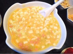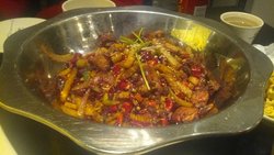 点评网团购优惠活动,25元买100元的券,一人限买一张,朋友帮我买了一张,三个人持两张券去的。其实三个人用一张券也够了,但是想着懒得跑第二次,就一次性用了,点了一份干锅兔,一份耗儿鱼,一份蟹黄豆花,一份卤排骨,完全是六个人的量,其实这样用很不划算,因为有3元一客的自助,自助有各种水果,炒饭稀饭和小点心。我看我们隔壁桌的一家老小五个人,就点了一份干锅,一份小菜,几个卤鸭头,然后全吃的自助。。。这样一对比,更显得我们三不是普通的二。。。再说说菜品吧,卤排骨吃起倒是挺香的,卤的也很入味,就是吃几块就腻着了。干锅兔份量中等,兔肉干香干香的,很有嚼劲。里面还有洋葱和土豆等配菜,辣味也合适,因为有小朋友在。蟹黄豆花是最好吃的一道菜,不解释,最后一滴汤都没剩下。耗儿鱼是被爷彻底唾弃的一道菜,完全没入味,鱼本身也不是很新鲜,即使加了那么多佐料也没掩盖住,而且不是那种大的耗儿鱼,是超市平价区卖的那种小耗儿鱼.