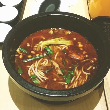 这家店就在银泰百货地下一层,环境很干净,店面不算大,就是人比较多。他家的阿香过桥米线做的很好吃,这个算是清汤的,不过也是骨汤熬的,给闺女点的,用砂锅炖的,保温性比较好,米线很劲道,里面还有鹌鹑蛋,一份26元,价格也便宜。