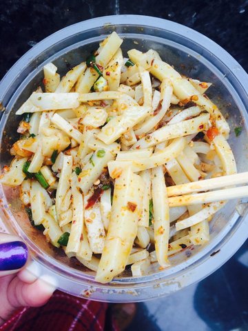 位置就在得意中心门口那里,搭建的一片小吃区。招商银行对面。其实说来解放碑这个地方,旅游的人很多。所以这家店也基本上是游客在光顾。主要就卖凉粉凉皮,也有刀削面和凉拌土豆。凉粉分白凉粉和黄凉粉。打了一份白凉粉,不得不说,这种凉粉不是我的菜,在家里都吃得是爽滑,比较嫩的那种凉粉。相比而来,这种凉粉就是干,很容易断,没什么口感。