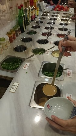 五彩城店,店面干净,服务热情。进门等位的有免费的爆米花和冰激凌吃,棒棒的。物美价廉,最棒的是各种9元的自助,蔬菜自助,饮料自助,小料自助,好划算。蔬菜自助最最划算了,不仅有各种常见的蔬菜,还有宽粉海带魔芋油豆腐等等等等。按照种类摆在自选台子上,每次见底了服务员会很勤快的去加,很卫生~~我的自助小料~ 不爱吃辣,用孜然+海鲜酱+大量芝麻调的。孜然酱真的是超好吃,每次都会挖一大勺子。锅底自选,可以双拼~ 我选的是麻辣锅和番茄锅双拼。48RMB,番茄超多,但不如新辣道的番茄锅底那么浓郁,感觉是番茄沙司没放够。。总共点了三种肉,两个吃货吃到肚歪。嫩滑牛肉 38RMB实在是太太太嫩滑了!一定不能涮太久!肥牛 32RMB 和 羔羊肉 28RMB肉质都很棒很棒,鲜嫩,但价格也都不算便宜。月光族的我们已经选的是肉里价格偏低的啦,两个人结账还是花了将近250。另外还是点了一些配菜的,比如鸭血,鱼豆腐神马的。主食的杂面还有芝麻火烧也很好吃~ 芝麻火烧3RMB一个,层次分明,芝麻很多~ Read More