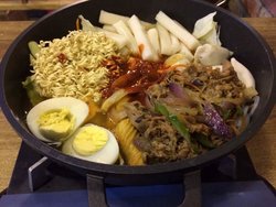 自从年前去韩国吃过这个年糕锅后,一直对这个美味恋恋不忘。好容易才知道武汉也有一家做部队锅,而且还在搞团购,赶紧和闺蜜一起去吃。部队锅大小和一般做干锅菜差不多,不过锅子表层是经过不沾锅处理的。刚开始锅里是没有水分的,将年糕、煮鸡蛋、泡菜、泡面、肥牛、豆腐金针菇等好多样东西整整齐齐放好,倒入辣酱慢慢焖煮,煮到一半就能闻到香香的韩式辣酱的气味,超级勾人食欲呵。越煮水分越多,等开吃的时候食材都是浸在泡菜汁里面了。别看食材花样挺多,实际上每一样的分量都挺少的,等煮熟后就更少了,两个女人吃这个火锅完全没问题。再说说这个火锅的味道,个人觉得一是韩式辣酱给的太少,被食材水分一稀释和吸收后,整个锅都带着甜味,很囧啊,本人在韩国吃的可是辣得不行了。二是食材花样太多,不同食材煮熟的时间不同入味差别也大,有时候年糕没及时吃会黏在锅底,焦糊了。鸡蛋倒是还不错,泡上辣酱水后吃着也不会觉得太干。这个锅吃完身上带着很浓的泡菜味,味道和正宗的还是有差别。