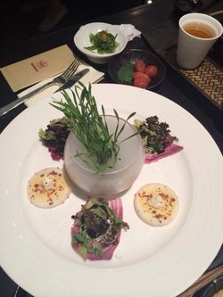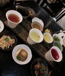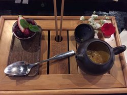 雕爷牛腩,全北京开了不少分店,基本上都是一样的。据说菜单隔个一两个月就会换一下,选择比较少,三种全餐/简餐,从前菜、汤、主菜、甜品四种自选搭配。店内环境不错,很适合情侣约会聊天,很有情调。一落座,服务员就会倒上不同种类的茶水,可以无限续杯,五颜六色的非常漂亮。每人面前四小蝶小菜,两个人还是不一样的,一共八碟六种,内容很丰富,吃吃小菜都能饱的感觉。点了一份最有特点的食神咖喱牛腩全餐,188元。200岁油醋汁沙拉,39元。介绍说之所以叫200岁,是因为全蔬菜配菌类,很健康。醋味儿很大,开始吃不适应觉得还是挺酸的。对于一人份来说,分量还是挺大的。汤类,选择了高棉的微笑,39元。酸辣味儿的,很开胃,很好喝。主菜必然要选食神咖喱牛腩,118元。设计很有想法,一盅咖喱牛腩,配上三碟不同米的米饭,再给一个大钵,自己倒入米饭,配上牛腩拌起来吃,很有特点。牛肉一般,咖喱汁还挺好吃的,米饭略硬,不得不说,分量还是挺大的,一个人根本吃不掉。最后甜品,冰与火之歌-黑松露冰激凌,42元。端上来先是干冰在底下冒着白烟,很仙儿。上面盖着一片巧克力,薄薄的。冰激凌在咖啡沫中间,拌着吃,很有特色。另外要说的是,用餐结束后,个人用的木质筷子会赠送给顾客,感觉既环保又贴心,筷子很好用,一下子好感度又提升了不少。…查看更多
