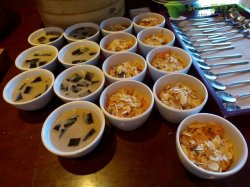 【洛】探店の龙之梦万丽酒店青餐厅~上海的天气真是湿答答额,真心潮湿,令人心境也略有些歌德~品尝美食的旅途仍旧没有停止,写上当下的心情,只为了记录旅途中的点点滴滴~上海的自助餐厅是有N多,但东南亚菜的自助餐厅却是屈指可数的~Celadon倒是别树一帜~以经营东南亚的美食为亮点!午市的价位是160元/位,MS晚市208大洋/位,自然是有区别的~但胜在环境好,view超好的份上,这个价位还算是物有所值的!而且服务也周到~午间时份,洛前去就餐,想不到午间的生意还是蛮好的哦~老外,霓虹人,上海人,旅游团均有~拿了些许咖喱鸡肉,黑胡椒牛柳,芥兰,还有少许的米饭~咖喱的酱料很赞,鸡肉吸收了咖喱香料,的确很入味~黑胡椒牛柳肉质也十分的细嫩~两者配着香米一起吃,恰好!其他的小菜及小食,有清蒸鲈鱼,咕噜肉,猪肉包,烧麦等等~小尝了些,味道一般~越南春卷,也是可以现作的,按自己的口味选择,洛分别要的是猪肉&虾仁~越南春卷的确是健康营养小食,荤素搭配,清新爽口!喜欢越南春卷皮子的韧性!自助台那边还有米粉,面条,蔬菜,肉类,海鲜,菌菇,丸子等等配料,也可按个人的喜好搭配,洛挑选了少许的泰国米粉,再配了丸子,金针菇,青菜,鱿鱼组合,要的是鸡汤熬制的~洛觉得这样的米粉真是清清爽爽,更能体现食材的新鲜!当然啦,还不容错过印度飞饼,还有沙嗲肉串,印度飞饼一定要趁热吃,香脆油么么额~很不错,配着沙嗲鸡肉串一起吃~至于甜品西点,他们家的款式不是特别的多,洛拿了香蕉蛋糕,瑞士莲,还有芝士塔,推荐芝士塔,芝士的味道还是蛮浓郁的,外层的胚子也是奶油味道十足~服务生的态度也超nice,为洛准备了女士伯爵茶还有豆奶~这一餐虽没有大鱼大肉,但也显得雅致了些~浅尝辄止即可~慢慢地品尝这些美食,再透过窗户看外面的风景,还是很享受的~看着犹如甲壳虫的小车,还有轻轨游走,让心灵放空吧~…查看更多