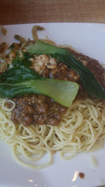 面兑面 中午在他家吃的饭,还不错,喜欢吃他家的肉酱面,肉酱咸鲜可口,面条很劲道,微微的有那么一点甜味,他家的凉面做的也比较好吃,浓郁的麻酱味道,拌在一起吃很香,还有他家的黄瓜条,清脆可口。
