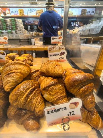 面包新语好像是新加坡的品牌,店面有一片玻璃墙,能看到烤箱和面包师傅劳动的身影。不过一直没有觉得他家有什么产品特别好吃。尽管如此,我还是执着地看到有新产品推出就会去试试。(我的钱包破了一个大洞)这款大巨蛋,很大,但是不用担心吃不完,起码我轻松吃完。很香软,上面表皮是甜甜的,略有脆的口感。口味还行,价格是十块还是十二吧。