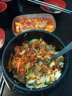 点的蔬菜拌饭 分量可以 味道还不错啦 有胡萝卜丝 南瓜片 洋葱片 鸡蛋 加上辣酱一拌啥都好吃了 哈哈哈哈还点了韩式年糕 还挺有嚼劲的呢 分量也可以咯 是小铁盒装起来的 蛮有韩国风味的样子不过年糕趁热才是最好吃的 冷了都粘一起去了:)他家生意一直不错的哈