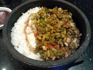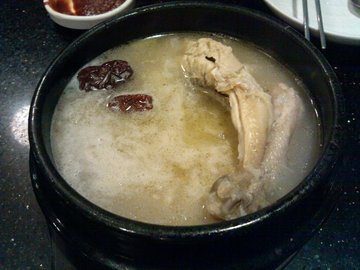 就在影院旁边,很方便。点了一个没吃过的石锅,名字忘了,就是蒜苗丁和蘑菇丁拌饭,有点辣,味道还好。人参鸡汤很不错,汤够鲜,但略咸,鸡肉很嫩,还有不太理解里面为什么会有米/米饭?送的小菜味道一般,卖相也不好…