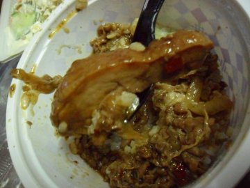 食其家是我经常打包晚饭和中饭的地方,日本的快捷连锁餐厅,服务和品质都过硬,而且上菜速度很快的,牛dong是首选,也是比较基本的款式,此外还有牛肉加麻婆豆腐,油焖茄子,酸豆角,鸡排的搭配,牛肉饭的味道很香,是牛肉自然的清香,没有过多作料的味道。