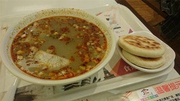 在五彩城地下一楼,空间很大,座位的间隔也大,可以看到妈妈推着婴儿车来吃饭,过道还挺宽敞,也没有油烟什么的,到饭点人也不是很多,工作人员收拾也很及时,环境很好。价格和楼上的餐厅比还是比较便宜的,在五彩城算是工作餐。在前台买卡,各个摊位点餐刷卡,经常来的还可以选择办卡充值,貌似也有会员活动。羊肉汤馍20,馍烤的很松软,撕成小块泡在汤里能很好的吸收汤汁。重庆小面13,就一个字,辣,剩下的没办法吃出来,像我这样不能吃辣的还是不要挑战了。珍珠肉丸15,看着还不错,肉丸里拌着马蹄粒,再滚上糯米蒸的,味道还不错,马蹄粒脆,但是糯米有点没熟透。西瓜汁15,放了好几块西瓜进去,没有掺水没放糖,很清甜解暑,纯果汁呀还是挺值的