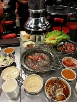 比较有名的韩国料理,看店的名字也有思密达的感觉。因为用的是炭火,所以感觉和电磁烤的味道是有些不一样,一开始我火候啥的控制的不是很好,牛舌都给你弄老了。不过后来我的手法越来越娴熟了,五花肉和肥牛朋友们都说我考的好吃,我也喜欢这里的南瓜粥,甜甜的,很好吃,喜欢用2片肥牛,沾上孜然粉,包在生菜里,一口下去,哇塞,好吃看的到,挺喜欢的。