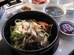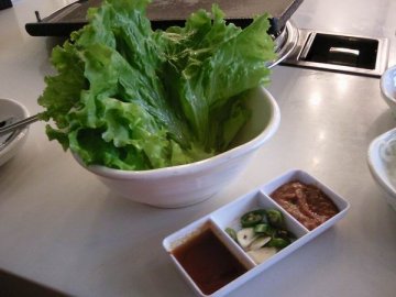 周末过去的,就在世界城,很好找,中午店里人还挺多的呢,他家环境不错,没什么油烟味~~~上来先给了6碟小菜,最喜欢海带和白萝卜丝,好吃~~~点了一盘肥肉,58元,这个口感稍硬了一点,容易烤老了~~~还送了生菜和小料,挺好~~~点了一份鲍鱼石锅拌饭,38元,貌似应该是有一个鲍鱼,切成了片,还有一些蔬菜、笋什么的,放了辣酱一起拌,不过还是觉得有点咸了~~~送了一碗海带汤,呵呵,也是感觉咸了~~~总的来说,对他家印象还是不错的~~~…查看更多