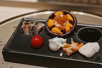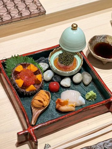 海膽飯手卷 / 馬糞海膽 / 味增湯 / 鵝肝金槍魚 / 闆塩を前菜乗せて / 刺身三點