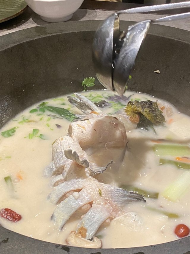 今日朋友帶我們去山姆購物,先到附近印力中心吃一餐,朋友介紹了一間吃蒸氣魚湯店。🚇交通:地鐵2號綫僑香站A出口,走十分鐘,在樂凱撒薄餅店旁。不過我們當然是滴滴叫車。🏠環境:灰色的門面,面積大而寬敞,全部座位皆是卡座,設有綠化裝飾,整體以灰色為主調,牆上有江上泛舟的投影畫,設計滿現代感中帶點中式味道。🤵🏻服務:人手下單,全程由職員負責用蒸汽消毒餐具、蒸魚等,不收取加一。🍽️午市:有一項固定收費,就是自助🫙醬料 ¥6/每人,包有特色醬油,水果茶和雪耳紅棗糖水任飲,其中一款菇蓉醬很出色,推薦大家必試。🍲青椒紫蘇鍋 ¥39這是湯鍋底配料,這款湯底一點也不辣,而且紫蘇葉味淡淡,🥰完全辟走了魚腥味,十分推薦!🐟江團魚 ¥171.6(2.2公斤)即點即劏的鮮魚,魚肉經高溫蒸熟,熟度完美,保持細嫩而少骨,😚最棒是奶白色的湯底,😋非常鮮甜而一點腥味也沒有,而且在寒冬下喝一碗,立刻暖洋洋!🥢鮮竹笙 ¥49🤩掛湯力強而爽口,又健康養生,非常推薦!🥢小米糕 ¥18這款可以當主食或甜品,比玫瑰餅更好,一點也不顯甜,味道有點似白糖糕,口感十分軟綿中點嚼口,個人十分滿意!…查看更多