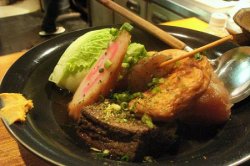 团购来的,有烤三文鱼头,原价23。挺大的一颗头,对于喜欢吃鱼头的我来说还是不错的。刺身拼,原价44。有两种刺身,三文鱼的和红金枪的。三文鱼的品质还不错,中规中矩。烤鸡翅,原价10元。鸡翅是切开来烤的,所以有点干,吃着略有些硬。关东煮大锅,原价15元。感觉原价好便宜呀,而且量是真的挺大的。里面的内容很丰富的,有白萝卜、鱼丸、鸡蛋、魔芋、海带等,味道甘甜,是我所喜欢的味道。查看更多