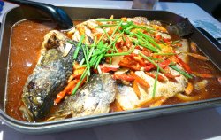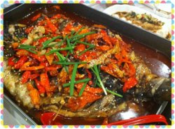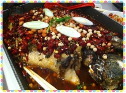 店在五角场万达特力时尚汇4楼,人气很旺,店有点小,都是方桌没有圆桌(鱼重而且盘是长方形的不太适合圆桌)和包间(地方小可以谅解)。我们预订了两张桌子拼成的预约座,有些挤,而且时间有是在吃晚饭的黄金时间,所以即使下着蒙蒙细雨,仍然有排队的情况。再说主菜,鱼!鱼都是一劈为二摊平放在长方形的加热盘子里,都是2,3斤的鱼(好像是),很重,电加热。选鱼当场烧鱼据说是他们家的传统烤鱼(4条)按上菜次序排列分别是草鱼——曼谷迷香(咖喱)、草鱼——销魂十八香、黑鱼——麻辣诱惑、清江鱼——斗味冬阴功草鱼——曼谷迷香(咖喱)是最早上的 比起后面上的几条 我更喜欢这个口味 咖哩香香的 非常好吃 一开始没把菜名和菜比对上 以为这道菜叫斗味冬阴功 感觉有菇的味道草鱼——销魂十八香 尝了一点 也好吃黑鱼——麻辣诱惑 是其中最辣的 但还不算这家店最辣的 上面铺满了干椒 爱吃辣的朋友要尝尝清江鱼——斗味冬阴功 吃的最多的一道 因为离的近 但是好像没有什么特色 也许前面的鱼吃多了 不像刚开始吃的时候那么仔细品味 味道当然还是很不错前两条不太辣 后两条有些辣。烤鱼伴侣:花枝招展、群英荟萃这两个我区分不出 近的那个有六样配菜:鱼豆腐、木耳、魔芋丝、豆皮、油菜、金针菇。吃完鱼把它们倒入盘中吃很鲜。但是配菜太少了,量和品种多点就好了。凉菜:黑白通吃、绿野仙踪、冰翠三味、酸爽双骄黑白通吃是皮蛋豆腐,绿野仙踪离的远没仔细瞧,冰翠三味是黄瓜配上三种调料,吃完才想起可以把黄瓜泡到鱼汤里吃,酸爽双骄是花生和荞面?粉丝?后者酸酸辣辣的,还不错。饮料:铁达尼奶茶、金桔柠檬、草莓奶昔、奥利奥奶昔、椰浆奶昔没点,跳过。未上菜的时候有倒过热水(觉得换成温水好) 也是之后不断倒入鱼中防止汤少鱼肉变咸的冰料:抹茶沙冰、花生沙冰、草莓沙冰、芒果沙冰、烧仙草沙冰是解辣法宝!!偶吃了后面三样 感觉都一般吧 味道略有些淡 但是沙冰的量很多 吃辣鱼最好点一个 烧仙草有些吃不惯(那你还点) 里面有五样东西(赤豆 黄桃 薏米?芋块 龟苓膏)主食:年糕、泡饼最后上的 蘸蘸鱼汤不错 可是已经辣的不行了 好像还有米饭 在饭上淋点鱼汤汁肯定很下饭。其它还有 餐具是一个两格的盘子 小的那个上画了一个鱼骨图案是放鱼刺的 不得不说鱼刺还是有的 吃的时候要小心 有一双筷子和一包湿纸巾 价格1元 还有桌上有纸巾可取查看更多