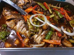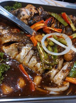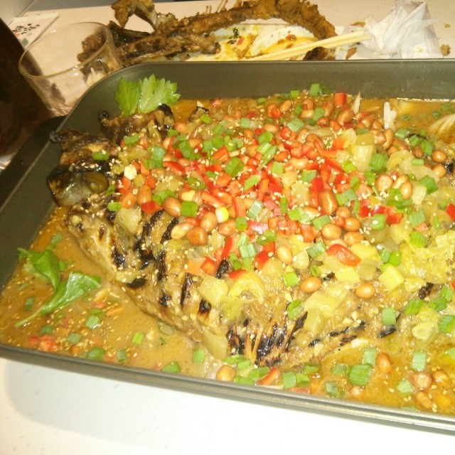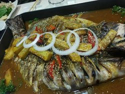 它家在华府天地二期2楼的最里面,周末去的,但店内的食客并不多。除了一名收银员外店内只有两名服务员,不过服务员很勤快,店内收拾的很干净。它家的鱼是活的现烤的,鱼个头都比较大,最小的也2.8斤,做法种类很多,不过大部分都是辣的。酱18香是极力推荐的做法,服务员介绍说资料是它家独门配置的。鱼刚端上来时就能闻到阵阵的酱香味,调料放的非常足。锅是通电加热的,点的配菜都需要下到锅里和鱼一起慢慢煮。鱼个头很大,吃的很过瘾,酱料味真的是不一般,有种浓浓的乡村菜味道,但鱼做的一点也不醒,而且汤特别适合下饭,不过鱼眼睛没了,不晓得是怎么一回事。查看更多