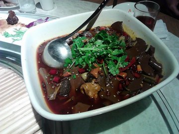 这家店n年前去过一次,那时候他们家生意老好的,味道不错,也比较实惠。最近又去次了一次,性价比还是很高的,不过我觉得味道没以前惊艳了。 毛血旺,里面大多是血,还零星有些毛肚、扇贝,辣度蛮结棍的,我觉得血还是老好吃的,嫩嫩的。 鲜鱿煲,别看那个煲不大,里面量倒是很足的,特别是鱿鱼不少,这点赞的。 蟹粉鱼结,这个是他们家的招牌之一了,菜端上来后,店家还好意提醒我们要“调一调”,这样蟹粉和鱼结充分融合,不会腥。这菜腥倒是不腥,不过偏淡了。 樟茶鸭,做得一般,鸭肉味道不是很香。 脆皮蹄髈,又是一个招牌菜,不过这次吃没之前那次吃的时候灵了,感觉量少了,一大块皮,里面精肉不多啊。 他们家菜量还是蛮大的,服务神马的也不错,比较实惠!…查看更多