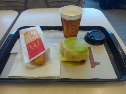 难得奢侈一回的说,在麦当劳点了个中西结合的早餐:油条配豆浆的经典搭配,外加一个汉堡。没想到食量还挺大的,这估计跟味道有90%的关系呢,谁让他那么好吃呢?油条比永和的都好吃呢,感觉不像油炸出的味道呢,因为完全不油腻,比较酥松,豆浆很浓郁香甜,没有外面勾兑水的嫌疑更没有外面多糖的成分,好喝,汉堡的话,跟其他的味道差不多的,还可以查看更多