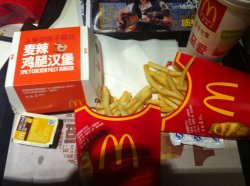 中午吃得十五元麦辣鸡腿堡套餐,可乐加大,薯条加大,最近还在搞活动,大薯还买一送一,真心得吃不了,嘿嘿,因为饭量比较小,所以只吃了两包薯条把大可乐喝了,汉堡打包了,我去得时候人不是很多,最让我满意得就是薯条还是新炸的,嘿嘿,我还要了一盒他家新出得酱,蘸了几根薯条觉得这个酱不是一般得腻人,不是很好吃,不过还是喜欢吃以前得蒜蓉酱,麦当劳得服务一直都不是很好,所以也没什么好说得..查看更多