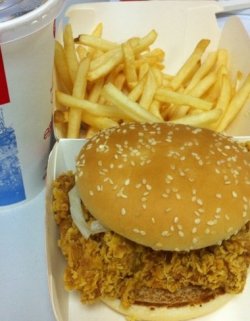 中午过来的,挺喜欢这里的环境的,很舒服的感觉,来了一份他们家的超值午餐,腿堡,薯条,可乐不加冰,最不喜欢可乐加冰了感觉味道会变淡,不好喝,汉堡还不错,味道很好,最喜欢炸鸡了味道非常的不错,另外他们家是薯条也很好吃,吃薯条不喜欢放番茄酱,喜欢放在汉堡里边吃。查看更多