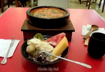 这是一家吃日式简餐的料理店,从外面看进去感觉很干净,环境也不错.我点了人家推荐的泡菜肉菌菇石锅饭.泡菜的味道有点咸不是很喜欢,但是里面的肉肥瘦相间味道很不错,里面的酱料调的也很好吃那!价位么有点小贵啦.