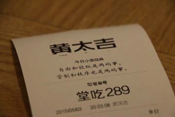 之前在北京吃过黄太吉,而且对其印象很好,在网上的宣传也是一代典范,喜欢小票上的每日箴言,所以从心里的感觉还是很好的。 荟聚的黄太吉也是武汉目前唯一的一家,所以去一次就要吃全,在一楼,位置有点小隐蔽,看着地图还挺好找的。 装修简洁,但墙绘还突出了武汉的特色,这点不错。出品的食物跟北京好像有所区别,点了鸡柳蔬菜煎饼,18元,但平心而论味道感觉挺一般的。