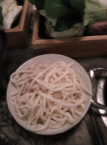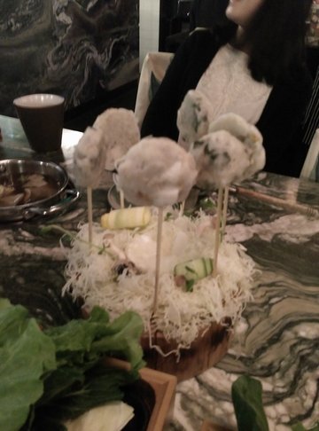 去他们家吃的午饭,点了午市套餐,然后再单点了些。他们家生意很好的,我们提前定了位。午市套餐相对有性价比,88元一个人,可以点一个锅底,一份肉,还有丸类、蔬菜拼盘和主食。汤底我选了黄金猪骨汤,里面有一块大骨头,汤底蛮鲜的,骨头上还带着不少肉。肉类,可以在牛羊猪肉中选一样,我选了牛肉,牛肉吃口还是很嫩的,吸收了鲜汤的味道,口感不错哦。丸类有香菇贡丸、手工蛋饺,香菇贡丸蛮鲜的,蛋饺的蛋皮厚实,肉馅儿味道也挺好的。还配了一个菜肉馄饨,馄饨皮劲道的。米饭和面二选一,我选了宽面,面条挺有嚼头的,煮久一点也不会烂。另外听服务员推荐,点了梦幻仙境棒棒糖,88元一份,只是比较噱头,做成把虾滑、鱼滑等做成棒棒糖的模样,再弄点烟雾缭绕状。一共六根,我们仨一人吃两个,我觉得一般啦,里面是啥东东也没尝清楚,我们还吃出了橘子皮的味道,有点甜的那种。点了份熟菜,台湾红曲烧肉,这个蛮好吃的,香口。开始不知道套餐的量,所以加点了三鲜馄饨和菜肉馄饨,反正一小份才三个。看到他们的活体菌菇,朋友有兴趣自己动手剪一下,就点了鲜活黄金菇,现剪现涮,新鲜哦。服务员态度还不错,就是生意好,有时候有点忙不过来。…查看更多