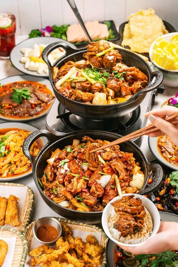 招牌家雞煲 / 炸腐竹 / 肥腸雞煲 / 豬肚雞煲 / 涼拌魚皮 / 醬香牛蛙煲